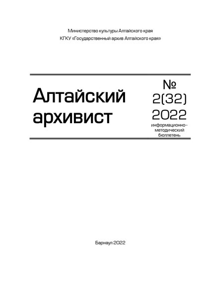Алтайский архивист № 2(32) 2022: информационно-методический бюллетень Министерства культуры Алтайского края, КГКУ «Государственный архив Алтайского края». Барнаул, 2022. 114 с.: ил.