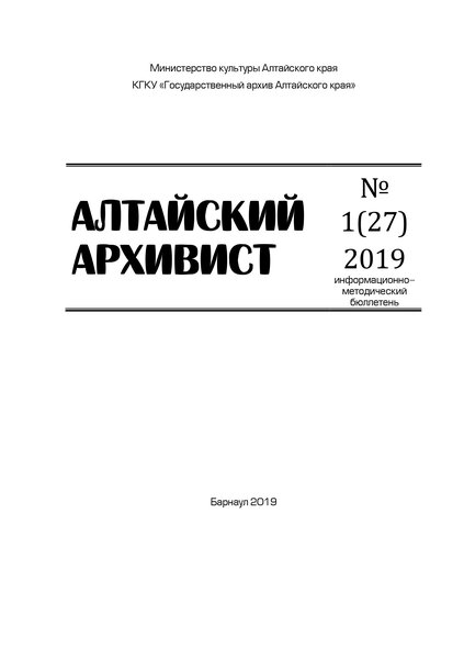 Алтайский архивист № 1(27) 2019: информационно-методический бюллетень Министерства культуры Алтайского края, КГКУ «Государственный архив Алтайского края». Барнаул, 2019. 200 с.: ил.