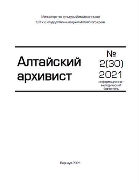 Алтайский архивист № 2(30) 2021: информационно-методический бюллетень Министерства культуры Алтайского края, КГКУ «Государственный архив Алтайского края». Барнаул, 2021. 124 с.: ил.