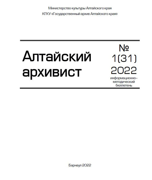Алтайский архивист № 1(31) 2022: информационно-методический бюллетень Министерства культуры Алтайского края, КГКУ «Государственный архив Алтайского края». Барнаул, 2022. 130 с.: ил.